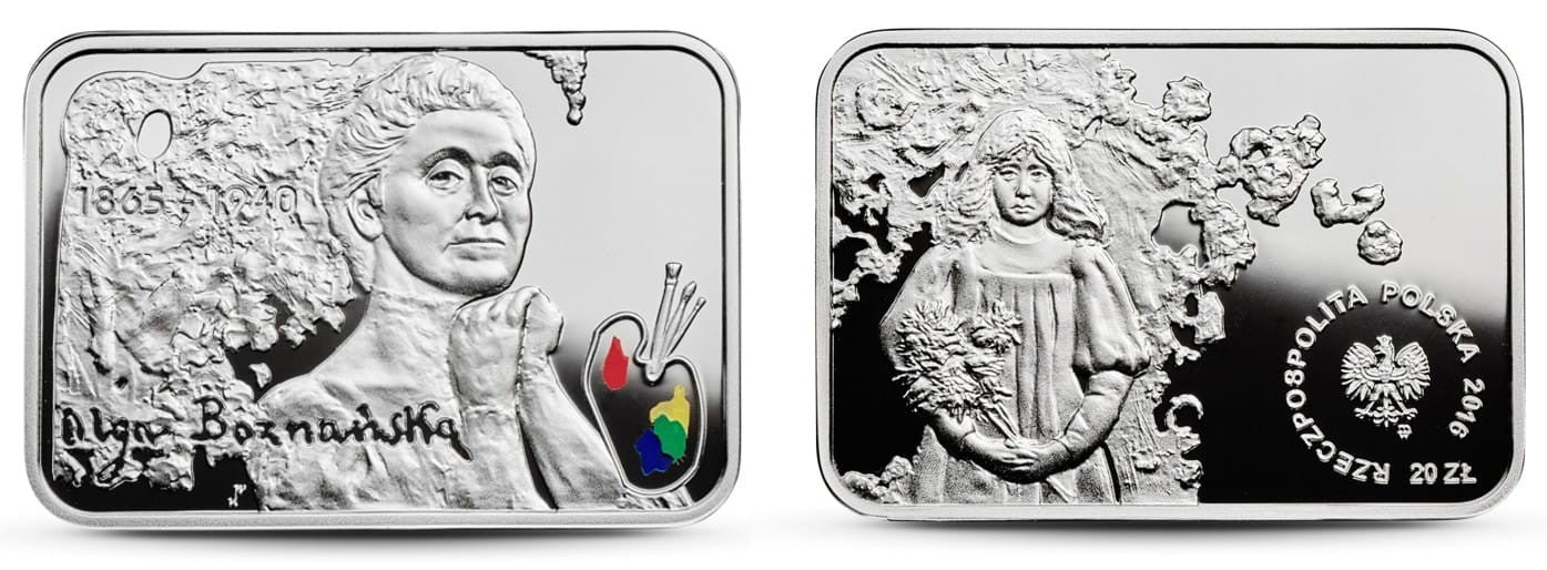 Awers: Awers monety przedstawia fragment obrazu Olgi Boznańskiej Dziewczynka z chryzantemami (1894, Muzeum Narodowe w Krakowie). W tle owalne plamy o nieregularnych kształtach, które nawiązują do sposobu kształtowania przez artystkę faktury malarskiej.